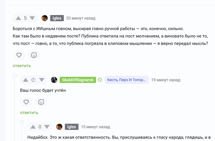 Печально, что оказалось, что очередной местный «топовый автор» не только подолгу обещает и не выполняет, не только льёт воду в контент, пипл же схавает, не только «пытается бороться с ИИ-шным скамом», генерируя скам своего авторства, но ещё и ссыт, что не вывезет критику и сразу банит. Чует, видимо, что критика не лишена справедливости, да?