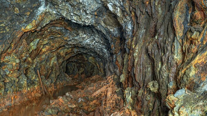 Заброшенный рудник весьма сложен для прохождения. Потоки воды сильные, в узких участках норовят сбить с ног и отправить купаться в мутных оранжевых водах подземной реки. Порода сыпучая, когда-то её держали защитные сетки. Теперь же похожие на немытую решётку для шашлыка защитные секции валяются на земле и норовят проткнуть сапог.