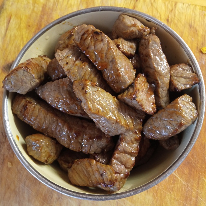 1. телятина, или говядина 600 грамм, высшего качества без жил, пленок и жира. нарежем ее полосками по мере возможности , сечением 1 см кв.