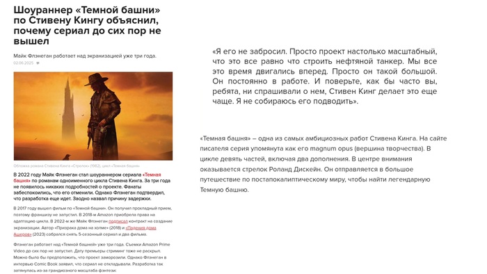 Некоторое время ждал сериал от Amazon, надеялся, что там хотя бы попытаются перенести цикл в сериальный формат, более или менее канонично, но, судя по последним новостям, там все глухо настолько, что, скорее всего, ничего уже даже и не будет. Вот и остается только перечитывать изредка старые книги и смотреть творения фанатов на тему «Темной башни».