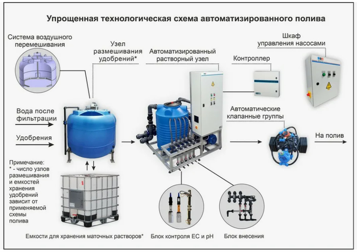 Растворный узел смешивает воду с маточниками в нужной пропорции и подаёт готовый раствор к растениям. Так как питательный раствор — единственный источник воды и питания. От того, когда и сколько его подать, зависит буквально всё.