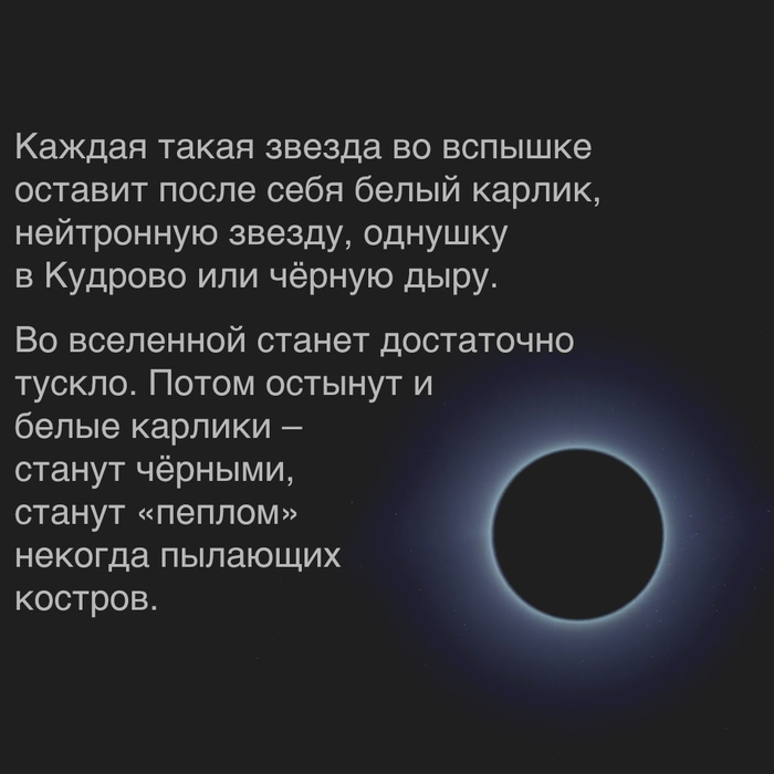 И так, если коротко, то по мере бесконечного расширения Вселенной связи между материей ослабнут и распадутся не только галактики и звёзды, но и молекулы, атомы и так далее – вся Вселенная растает, превратится в пустое пространство, где нет ни материи, ни энергии (тепловая смерть). А чёрные дыры? Ученые говорят, что чёрные дыры испарятся!