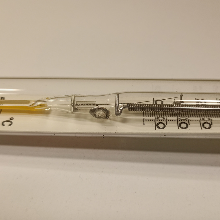 И вот случайно эта крутилка сбивается рукой (что то там наверное уже было отломано) и открывается, вуаля: стеклянная, подковообразная колба, с контактами внутри и каплей ртути, и все это на биметаллической спиральной пружинке. Делов то…