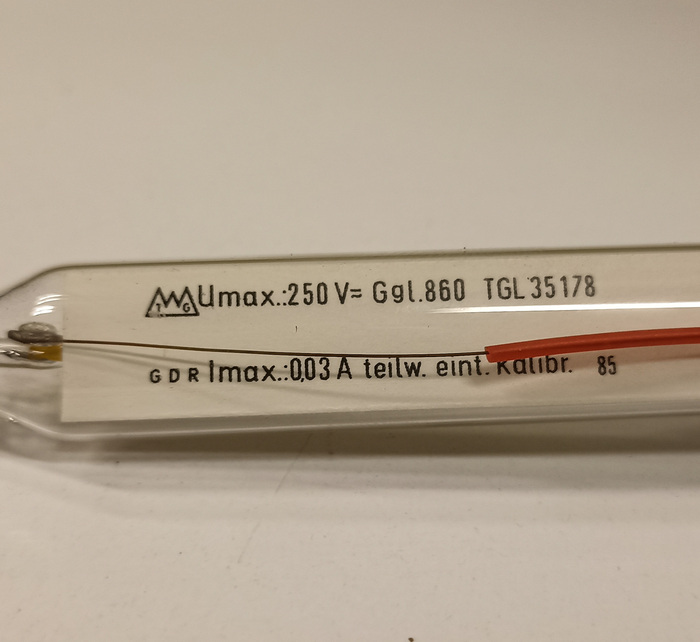 Поясняющие надписи: максимальное напряжение 250 В, максимальный ток 0,03А, TGL35178 - модель. 85 - возможно год изготовления