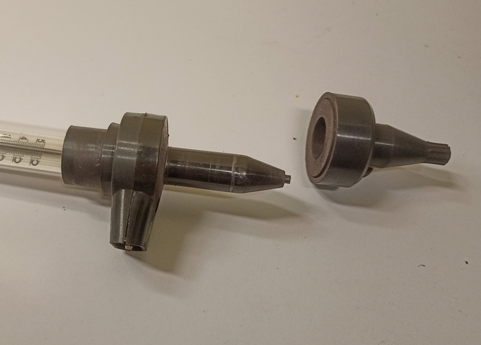 А вот тут становится понятна суть набалдашника (внутри его самого кольцевой магнит), на шнеке видна пластина, на которую бесконтактным способом воздействует поле магнита при его вращении, тем самым выставляется бегунок на верхней шкале на заданную температуру срабатывания