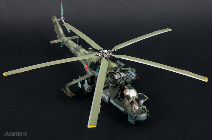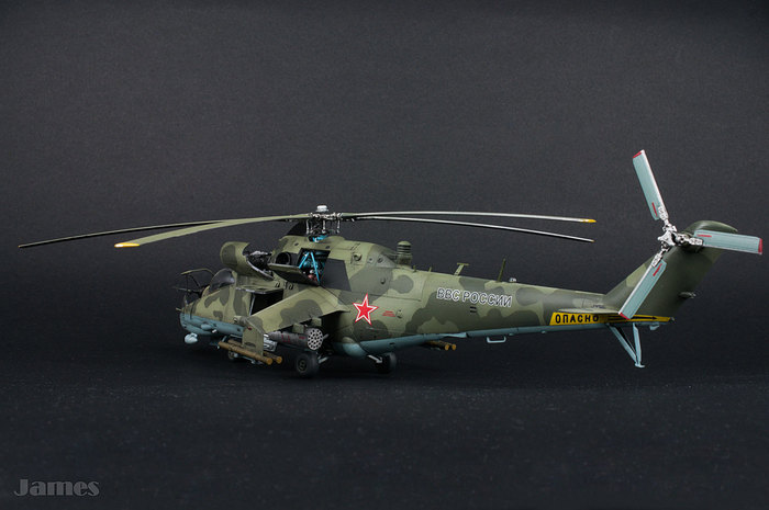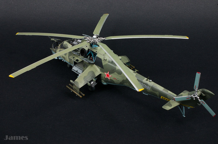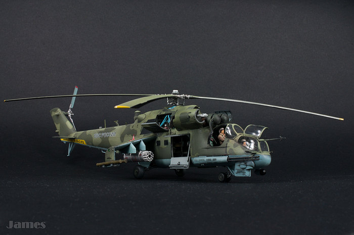 Российский ударный вертолёт Ми-24П от "Звезды" в масштабе 1/72, тестовая сборка для обложки коробки. Номера (34 желтый, RF-91832, Авиагруппа ВКС России в Сирии, авиабаза Хмеймим, 2016 год) на модели нет, т.к. на момент сборки не было ни декали, ни ниструкции.