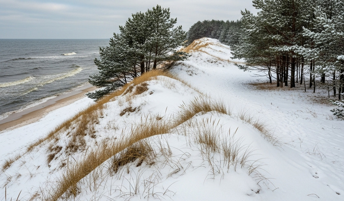 Если устали от города, вам сюда. Куршская коса — чудо природы. Узкая полоска песка, разделяющая Балтийское море и Куршский залив. Она внесена в список наследия ЮНЕСКО. Зимой коса выглядит сурово и величественно. Дюны припорошены снегом, сосновые леса стоят в тишине, море яростно штормит.