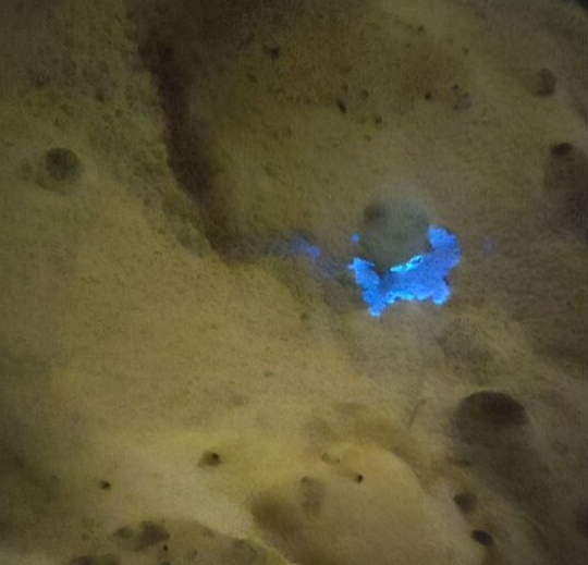 Фотка с синим пятном- не баг , а фича, эффект флюоресценции минеральных отложений на участках свода пещеры.