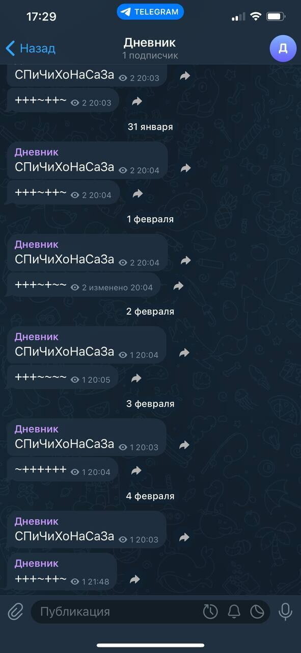 Чтобы выработать все эти привычки, я завел всего одну. Каждый день в 20:00 мне в Телеграм прилетает напоминалка (триггер) следующего содержания: «СПиЧиХоНаСаЗа». Это означает: спал, писал, читал, ходил, настроение, самочувствие, зарядка. В ответ на это сообщение я пишу плюсы или минусы. Выглядит это так: