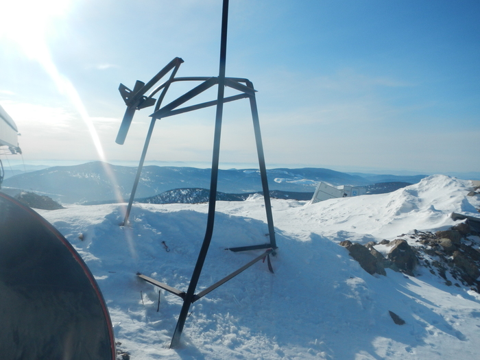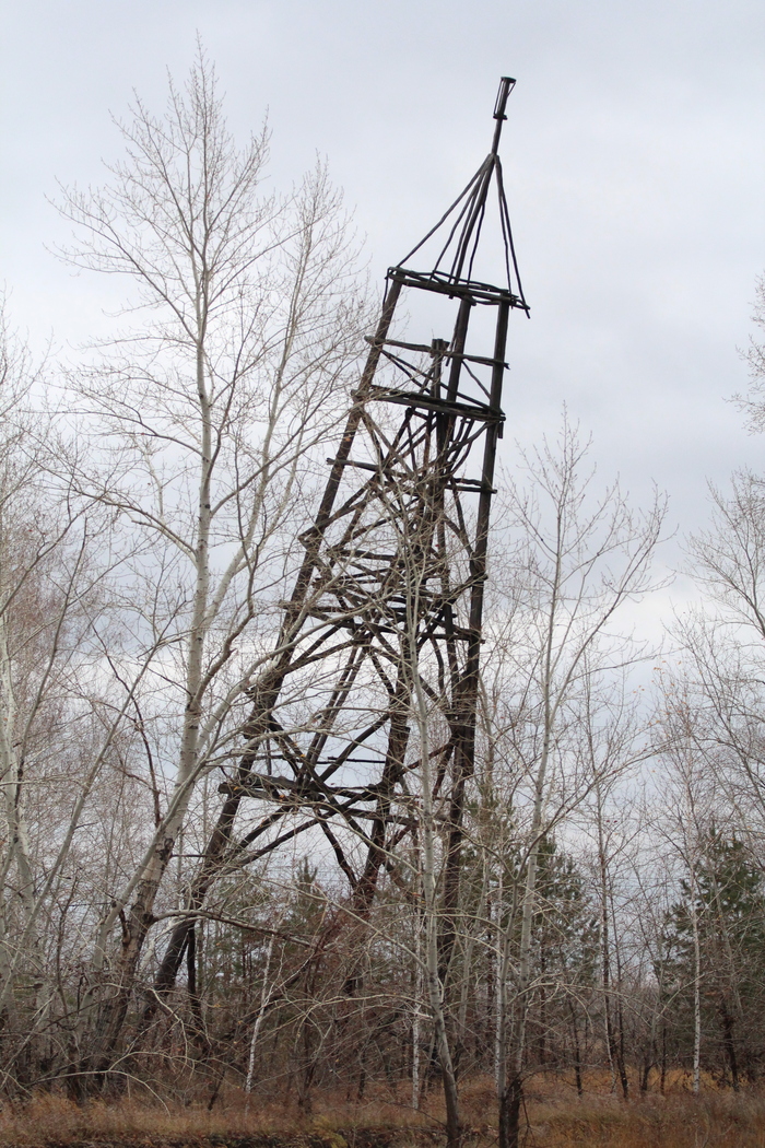 Ниже по склону лежит деревянная пирамида. сейчас, с внедрением спутниковых технологий они не нужны. Не поддерживаются, приходят в негодность, гниют, горят с лесами. Мешают наблюдениям. Но раньше это была основа-основ. Залезая на вершину всегда представлял, как сложно было тем, кто пришел сюда до нас и это всё построил. Соседняя вершина, в паре сотен километров, как раз та, которую описывал Федосеев в своей книге.