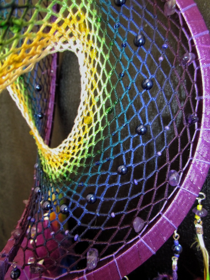 Вот на этих фото отчётливо видно, сколько оттенков нитей в этом относительно небольшом ловце. Это создаёт удивительную глубину при вращении ловца. В следующем посте покажу его в движении, это очень залипательно)