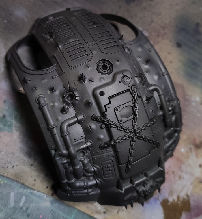 Первый, давно мне известный жизневзлом - чёрную деталь можно измазать металликом с помощью техники "сухая кисть" и тогда получится очень глубокий металлический блеск на тёмной подложке, который уходит в глухой черный при отсутствии освещения. Это наваливает плюс сто к контрастности в естественных условиях и снимает с нас необходимость рисовать тени вручную.