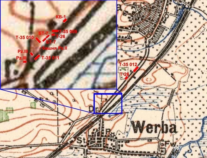 Так вот, перейдём к самим боевым действиям. Самый яркий эпизод БОЕВОГО применения Т-35 - бои группы Попеля под Дубно, а именно бои 29-30 июня под Вербой. В группе Попеля на тот момент оставалось 4 пятибашенных машины. 29 июня эти танки занимали оборону (или же были подвижным резервом, что вероятнее всего) вместе с тыловыми частями и танками 34-й танковой дивизии занимали оборону на южной окраине села Птиче, далее на запад до посёлка Тыртыны и высоты 275. За ними, на высотах северо-западнее Птиче, находились Т-26 в капонирах и несколько орудий дивизиона 7-й моторизованной дивизии (76-мм пушки и 122-мм гаубицы), в лесу между нас.пунктами Трытыны и Турковиче предположительно размещались танки подвижного резерва, в который как раз и могли входить танки Т-35 . Эти подразделения вечером 29 июня отбивали атаки группы Зикениуса. Группа была в составе 2-го танкового полка 16-й ТД, 2-го батальона 64-го мотопехотного полка, взвода 8.8 см зениток и взвода 2 см зенитных орудий. Точно неизвестно об участии Т-35 в бою этого дня. Единственное встречавшееся в немецких источниках за 29 июня упоминание, которое можно связать с Т-35, это радиограмма 111-й пехотной дивизии открытым текстом, в 10.30 утра зафиксированная в ЖБД 55-го армейского корпуса: "в километре южнее Вербы тяжелые русские танки".