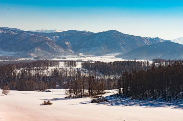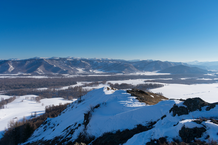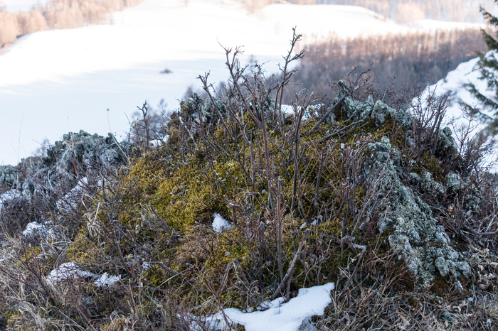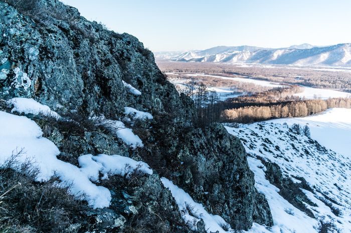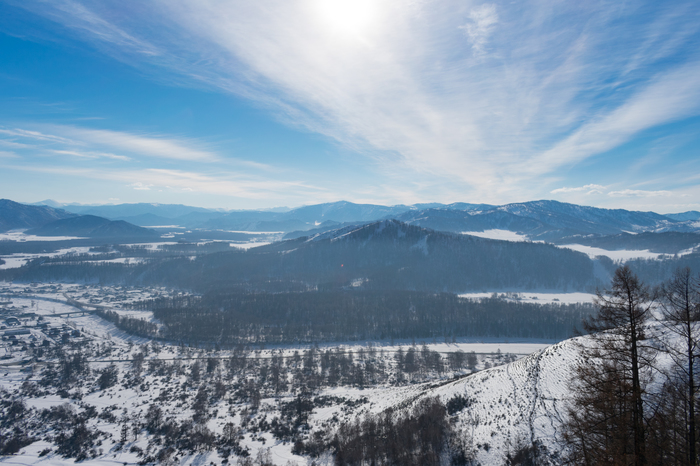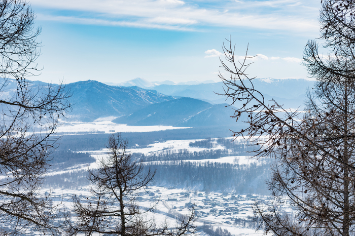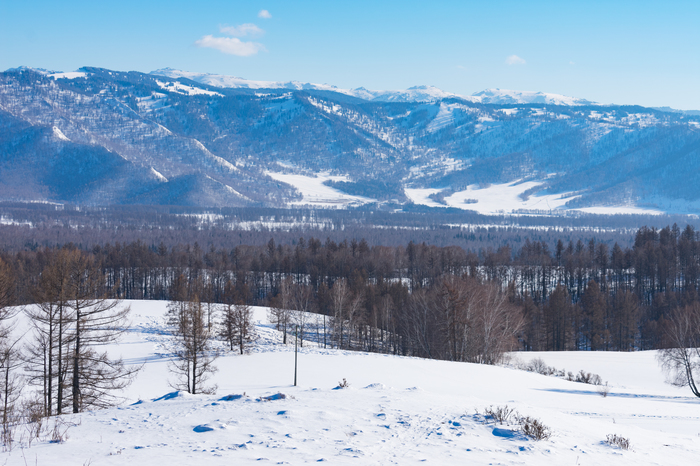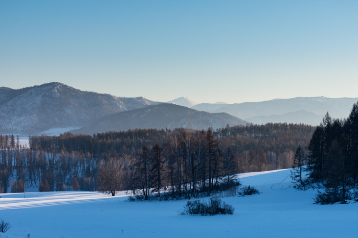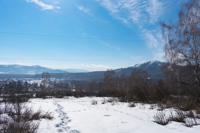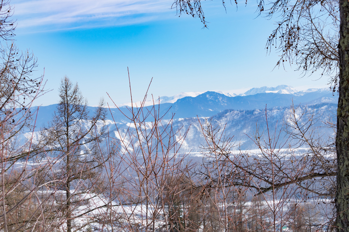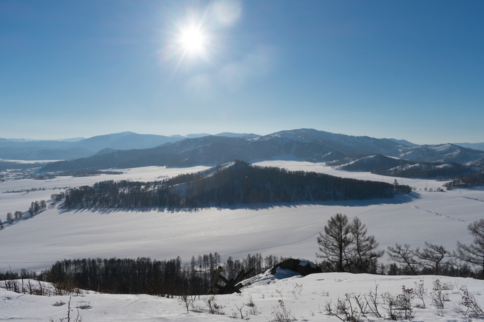 На этом фото в самой глубине горизонта можно рассмотреть одиночный высокий белок (так в Сибири, а может, и ещё где-то, называют вершины гор, на которых снег не тает). Название этой горы мы позже узнали - гора Красная. Говорят, возле неё какие-то озёра красивые, советовали летом приезжать, чтобы посмотреть. На самом первом фото в посте она же.