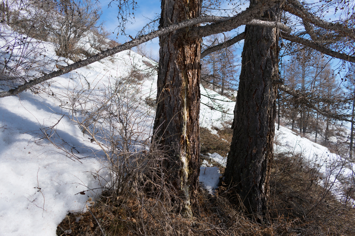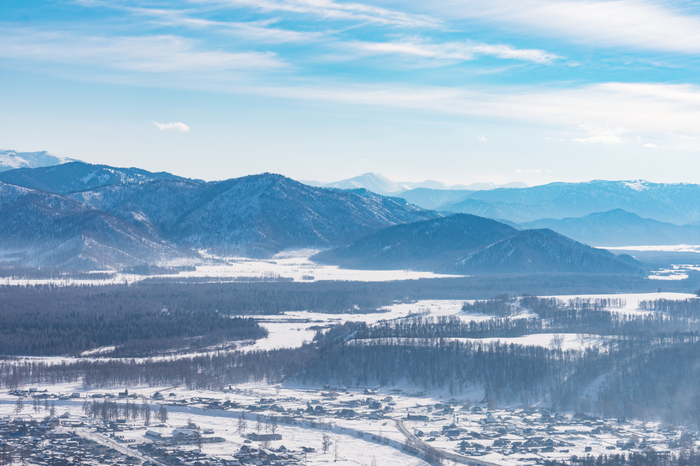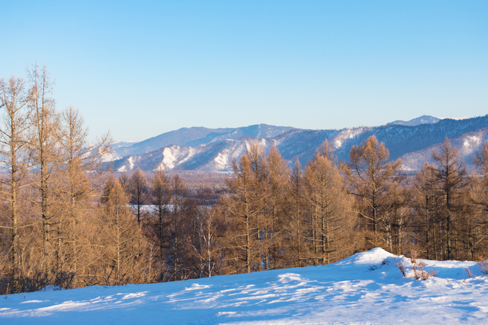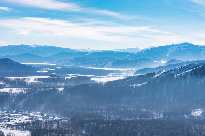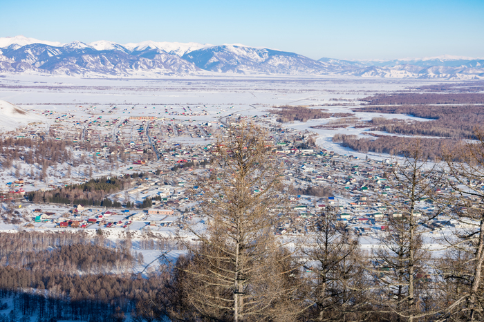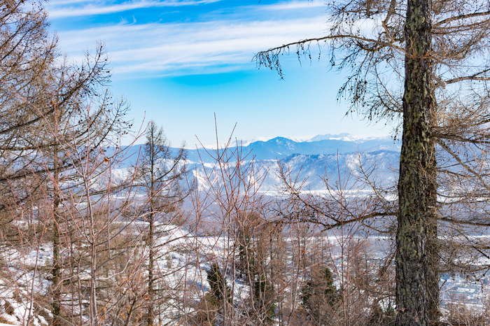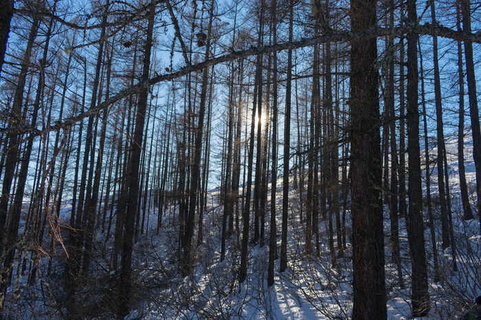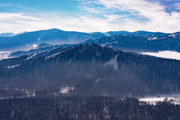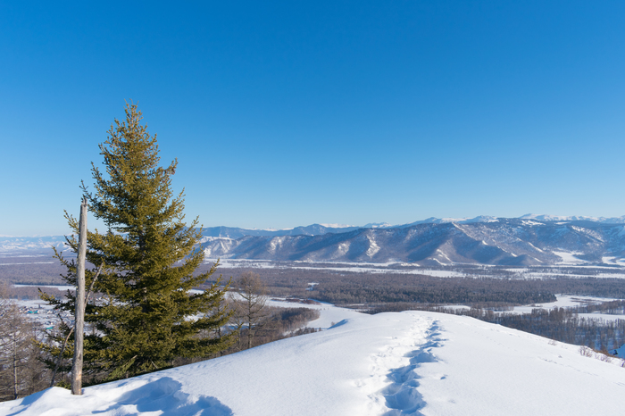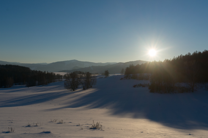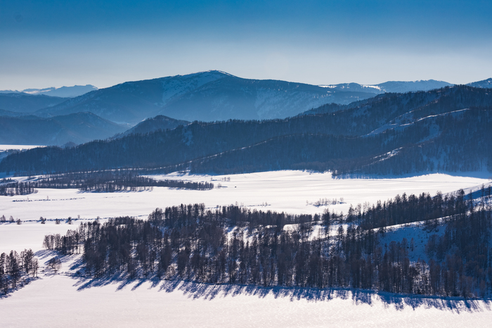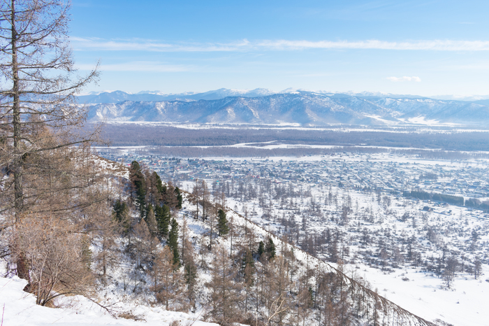 На этом фото в самой глубине горизонта можно рассмотреть одиночный высокий белок (так в Сибири, а может, и ещё где-то, называют вершины гор, на которых снег не тает). Название этой горы мы позже узнали - гора Красная. Говорят, возле неё какие-то озёра красивые, советовали летом приезжать, чтобы посмотреть. На самом первом фото в посте она же.
