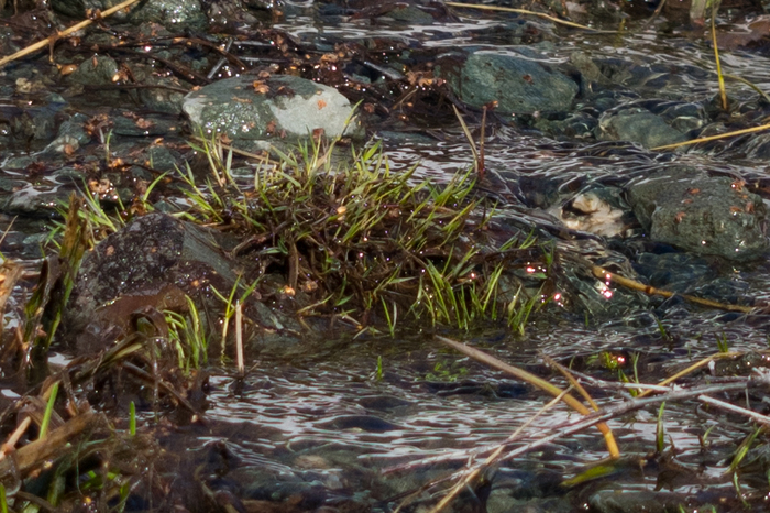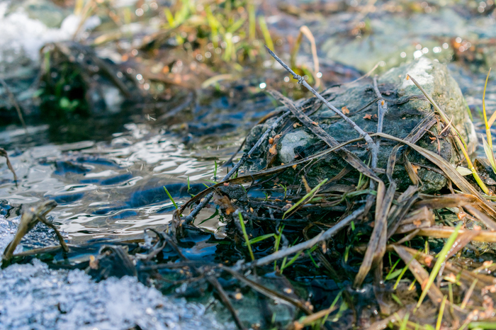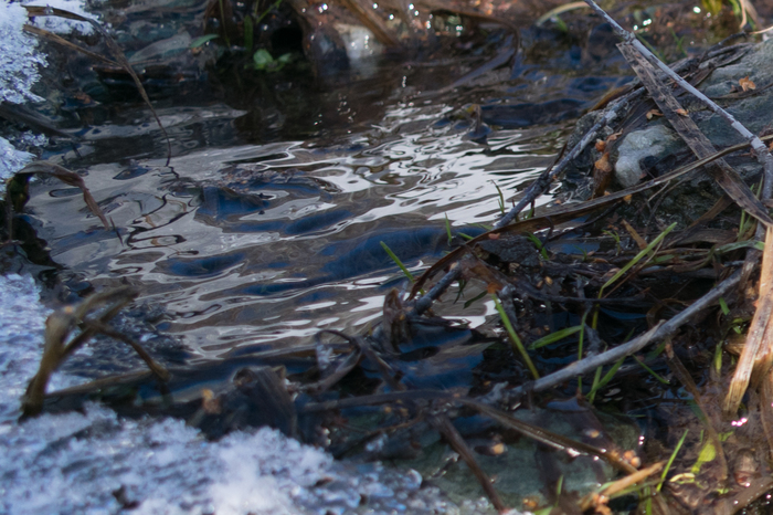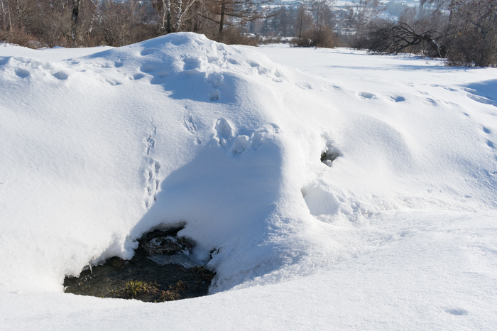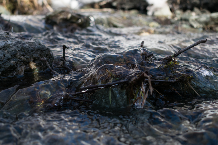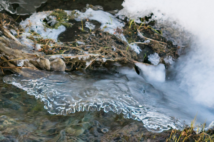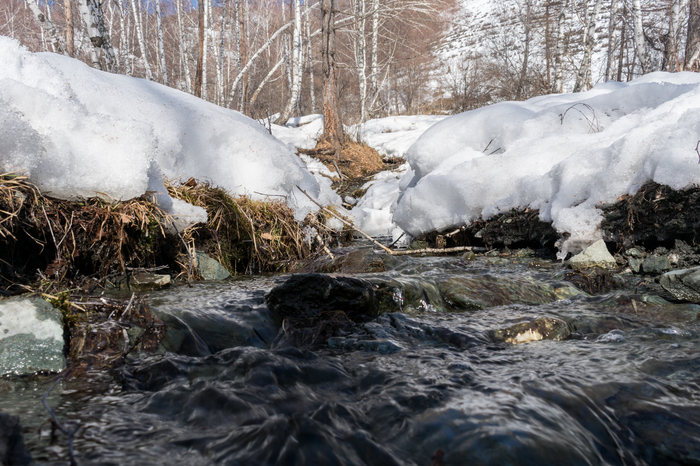 Поднявшись немного вверх, мы встретили первые ручейки под снегом. Радости моей не было предела, так как одним из моих желаний было поснимать текущую воду во время поездки, а, как назло, Кокса была ещё подо льдом. Повезло, что у меня были резиновые до щиколотки сапоги - мы, конечно, всё равно ноги выше колена насквозь вымочили, пока лезли, но хотя бы сразу внутрь не затекало.