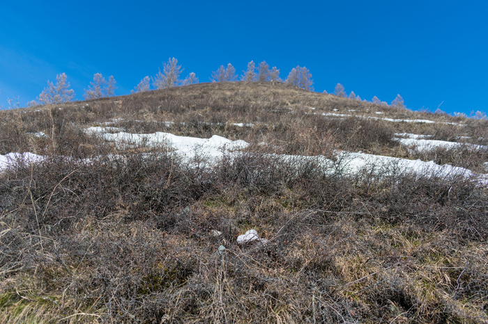В какой-то момент мы посмотрели вверх и увидели примерно то, что на фото ниже. После этого некоторое время было не до съёмок - пыхтели и карабкались. Издали казалось, что склон почти без снега (на фото тоже так кажется), однако снег был - под пружинистыми колючими кустиками, какими-то ровными слоями устилавшими землю. То есть сначала проваливаешься в кустики, потом проваливаешься в снег, потом соскальзываешь по склону.
