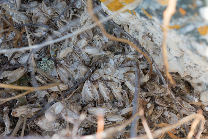 Я набрала полные карманы камушков на память, пофотографировала милые лишайнички. Под некоторыми валунами мы обнаруживали целые кладбища каких-то крупных ночных мотыльков. Некоторые как будто какими-то яйцами обсыпаны. Кто знает, чего это они, а? В интернете не нашла, но масштабы впечатлили. На фото только одно такое кладбище - вокруг камня и в расщелине их несколько сотен, не меньше.