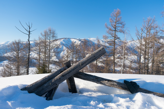 Нам повезло - сразу за деревней мы наткнулись на старую колею снегохода. Снег на ней был более плотный, проваливался всего по щиколотку. Мы пошли по ней - колея, петляя, поднималась, однако вскоре стало понятно, что запланированную нами горку она огибает и уходит куда-то за низенький заснеженный косогор.