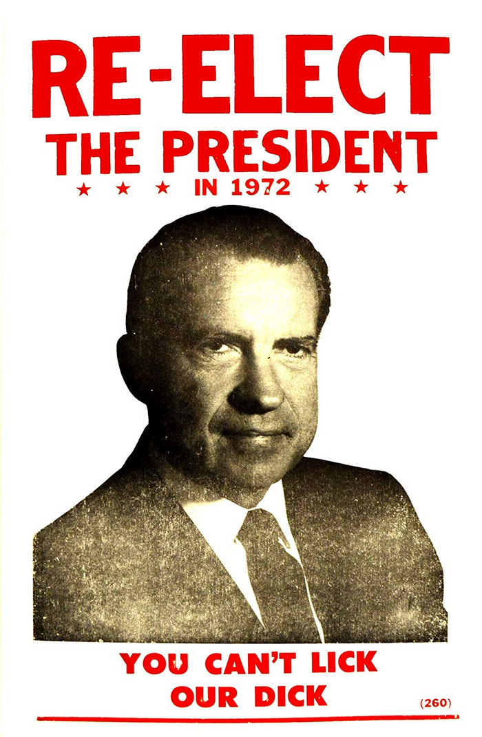 Ричард Никсон был карикатурной внешности квакером, которому удалось завоевать всенародную любовь. Посмотрите на него: несуразный, с порочными и злобными глазками, он полюбился людям, доказав им, что он — добрый и простой американец, соль нации. Но не все так просто, в это же самое время он разыгрывал карту плохого парня, настоящего bad-ass: непредсказуемого, опасного, даже мудаковатого. Балансируя между этими двумя противоположностями, он и стал президентом, обойдя демократа Макговерна, который делал упор только на положительный образ.