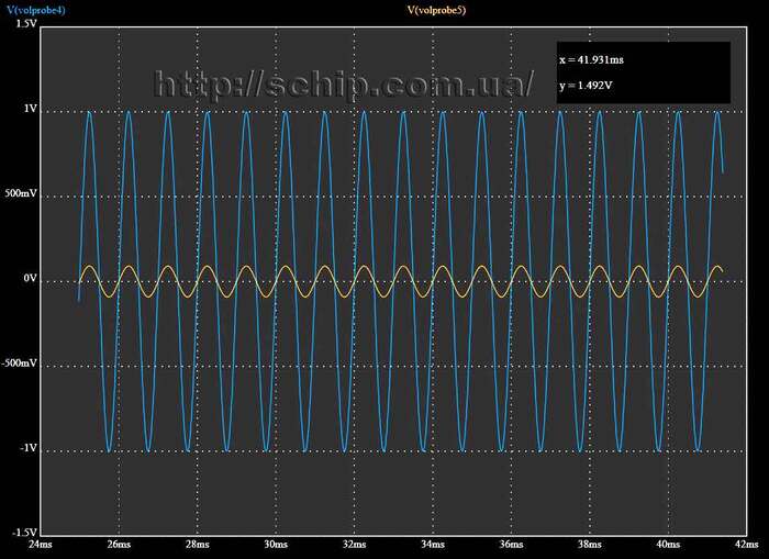На осциллограмме наши два сигнала синий график это входной сигнал и светло-жёлтый — это то что мы имеем на нагрузке.