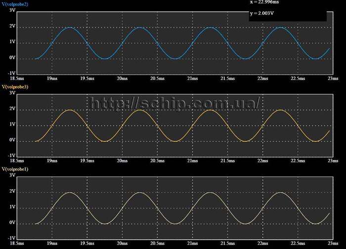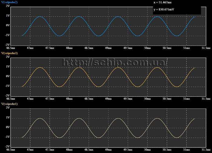 Вот конечный результат наших измерений. Как видим наши три идеальных сигнала полностью совпадающих.