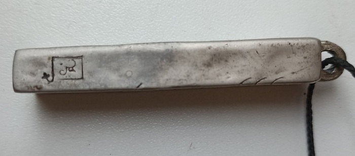 Здоровенный и достаточно увесистый прямоугольный слиток с надписью, подвешенный на прочный шнур. В ладонь помещается.