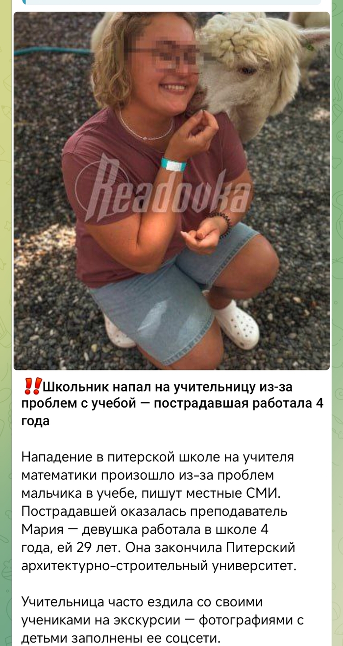 Мать напавшего на учительницу в Питере недавно записала его на дополнительные занятия по этому предмету. Школьник по договоренности с преподавателем пришел к 7:10 исправлять контрольную — и напал на учительницу, когда она отвернулась.