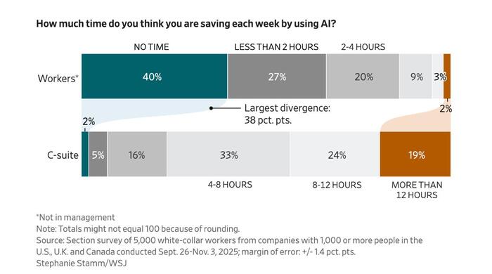🐌 Другой статистикой по поводу AI поделились в Wall Street Journal – согласно ей, пока топ-менеджеры компаний радостно сообщают о 8+ часах в неделю сэкономленного времени благодаря нейросетям, большинство обычных рядовых сотрудников не видят в этих инструментах практически никакой пользы.