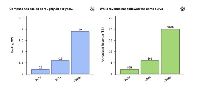 🐌 А еще OpenAI раскрыли свою формулу роста, выложив на своем сайте график, где всё сводится к простой корреляции: чем больше у компании было вычислительных мощностей, тем больше была ее выручка. Вывод очевидный – нужно еще больше компьюта, и тогда заживем!! Ну, или, по крайней мере, инвесторам такую историю рассказывают…
