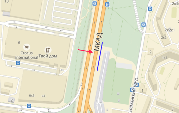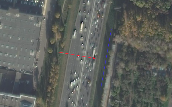Если смотреть по карте, то выглядит это вот так (красная стрелка - направление съемки, а синяя полоса - это забор):