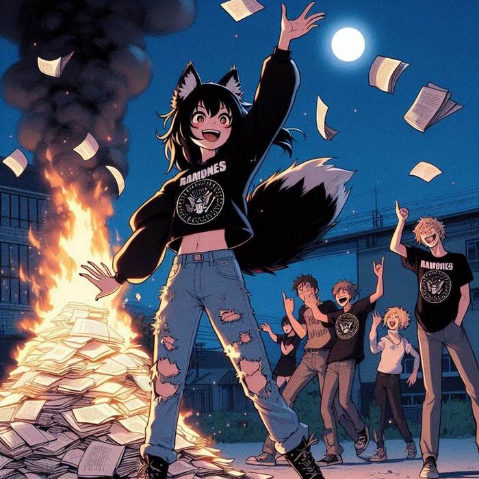 На следующий день после окончания школы я устроила торжественный ритуал сожжения всех-всех школьных тетрадей и дневников. Я вообще подбивала на это одноклассников - устроить гигантский костер во дворе школы, но в классе идею не поддержали. А вот ребята из панковой тусовки поддержали. Потом мы разбегались под вой сирен пожарных.