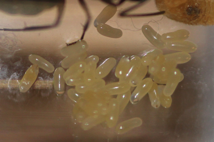 Один из рабочих, видимо, по природе своей интроверт и ждал этого момента долгие месяцы. Он проследовал в дальнюю часть формикария и уселся под навесом из мха, глядя на прозрачную стену и спокойно размахивая усиками. Судя по всему отдыхает от переизбытка общения в уже тесном основном гнезде. Расплода всех возрастов в семье навалом, крупные прошлогодние личинки уже начали плести коконы.