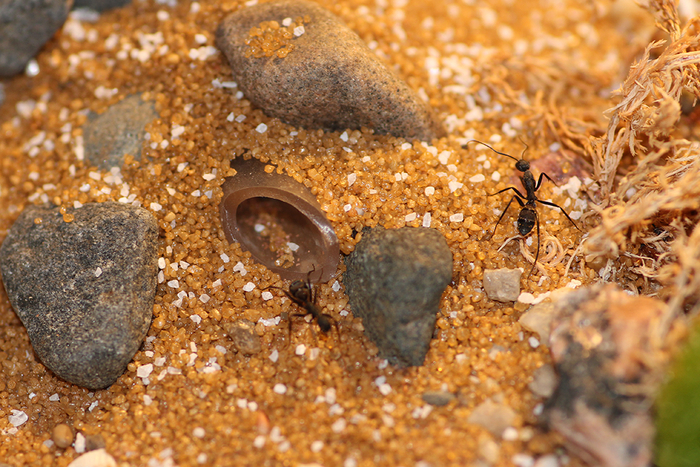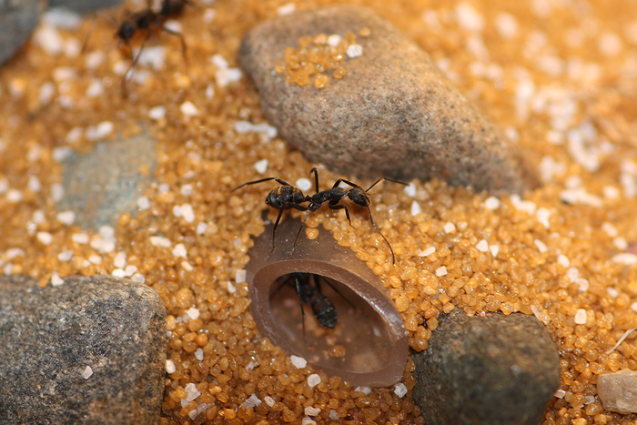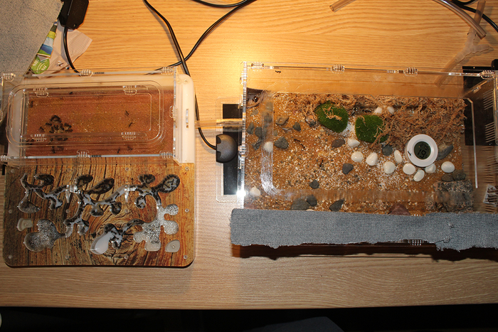 25 января. Наконец-то доделал большую арену для круентатусов. Сделал я ее из старого формикария камчатцев. Я предварительно разобрал старый формик, полностью помыл и почистил, а затем собрал вновь, сделав на арене уже не кусочек Халактырского пляжа, а уголок испанских прерий. Жилые блоки на данный момент оставил закрытыми, подожду пока более плотно заселится гнездо основного формикария. Но для рабочих уже сейчас стало больше места для того, чтобы размять лапки. Причем на исследование новых территорий сразу хлынула пара десятков разведчиков. Буквально в ту же секунду, как я убрал ватку перед присоединенной переходной трубкой.
