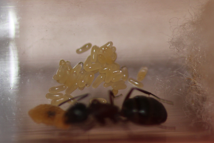 Утром 6 числа повторил процедуру, но ещё добавил к столу пару маленьких тараканчиков, чтобы начать разогревать интерес к белку – всё же в гнезде довольно большое число перезимовавшего расплода. Но пока так же особого энтузиазма не увидел. Матка жива и весьма энергична, к утру в целом муравьи уже распределились по всему гнезду, восстанавливая порядок в нем.