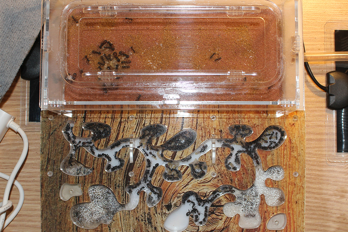 В 10-х числах января включил обогрев арены. Муравьи уже стали достаточно активными. Сразу же зона у выхода из гнезда превратилась в большой солярий для просыпающегося расплода.