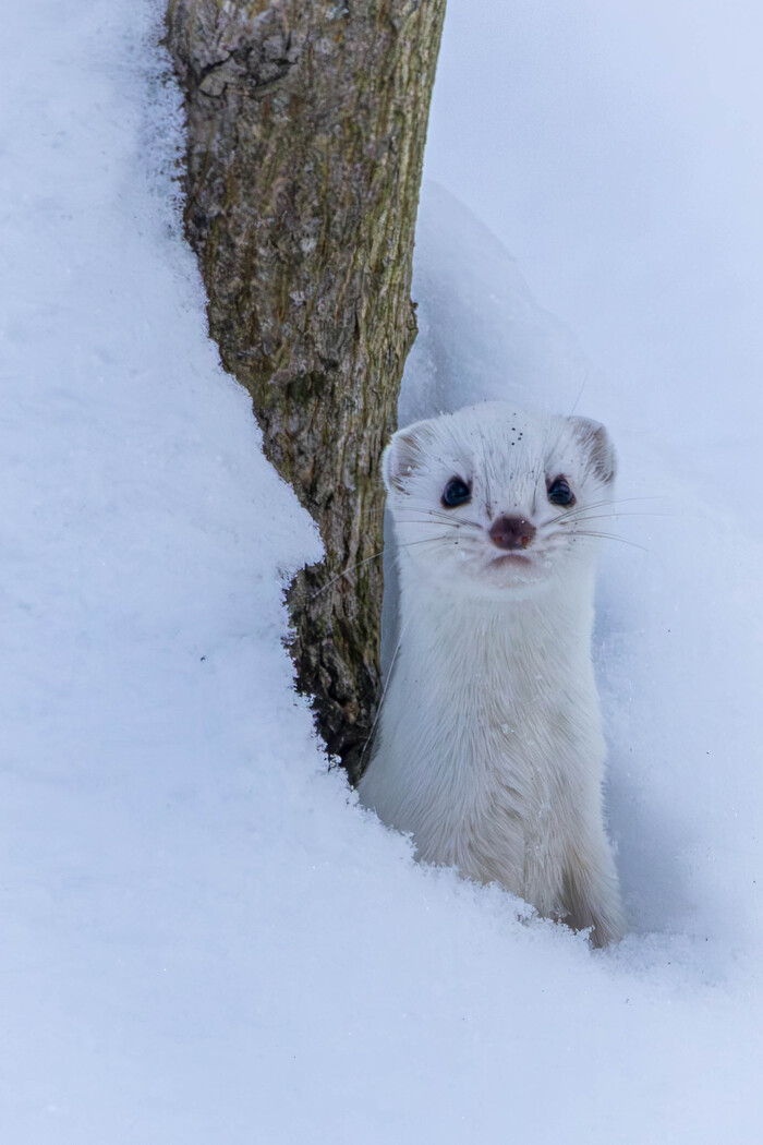 Отдельный квест — сфотографировать ласку. Она крайне непоседливая, шустрая и быстрая. Забежав в одну норку, она может выбежать в абсолютно другом месте, прямо из-под снега.