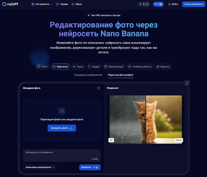 💡 В сервисе ruGPT.io это реализовано через технологию Nano Banana — достаточно загрузить фото и написать запрос, и нейросеть автоматически применит нужные изменения без ручной настройки инструментов.