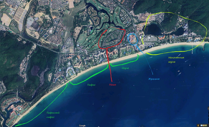 Давайте несколько вводных про Хайнань. Это такой китайский остров. На его южном побережье есть город Санья. В округе которого имеется некоторое количество бухт живописных и не очень, где и раскинула свои мохнатые лапы китайская пляжно-туристическая машина. Круглогодичные температуры выше 25°, зеленые пальмы, тёплое море. Сам боженька велел развивать туризм. И развивают. Плюс, говорят, очень вкусно получается по налогам. Что-то вроде свободной экономической зоны.
