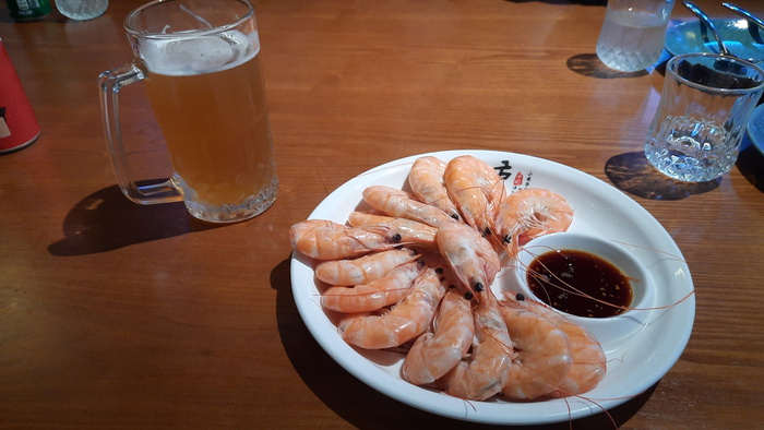 Такая порция креветок – 52 юаня (умножаем на 11). По размерам – кружка пива 0,5. Она, кстати, по 15 юаней.
