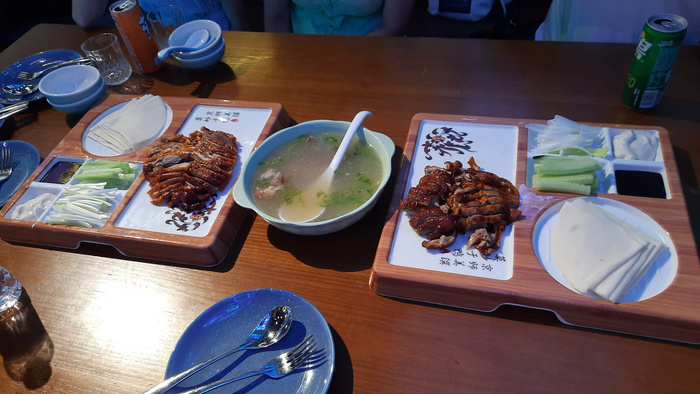 Утка по-пекински. Это большая порция. Цена – 168 юаней. Наелись четыре взрослых человека.