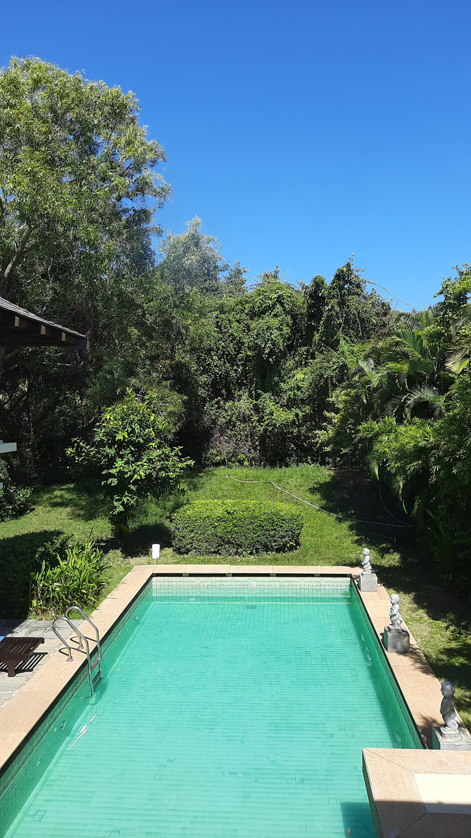 Закрытую со всех сторон территорию с бассейном, длиной 15 метров.