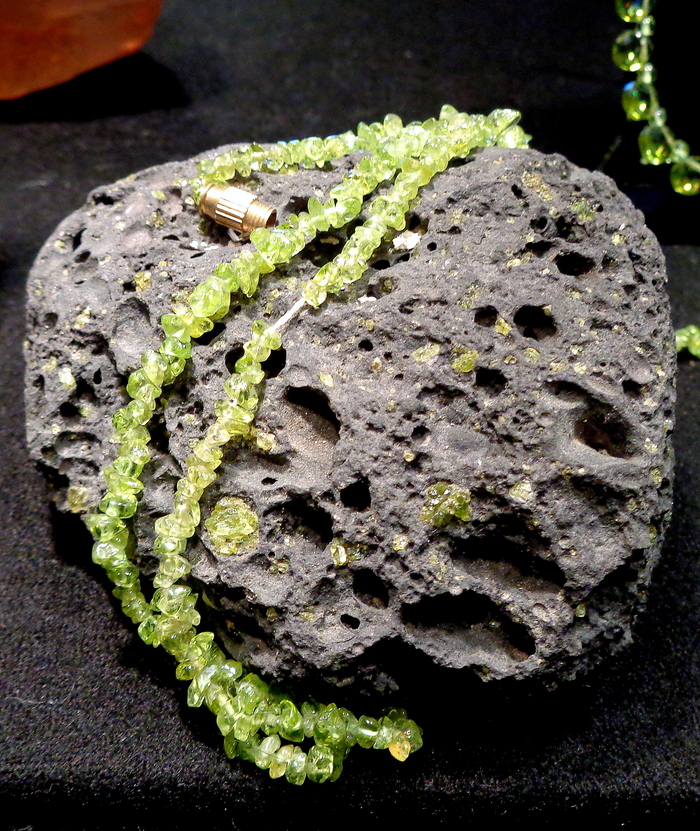 Желтовато-зеленый хризолит во вкраплениях в кайнотипном щелочном базальте и бусы из него. Гавайи