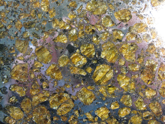 Но хризолит является не только земным минералом! Нередки его находки и в космических гостях – метеоритах… Ещё в конце XVIII века он был изучен исследователем П.С. Палласом в гигантском железо-каменном метеорите, упавшем в районе Красноярска. Такой тип метеоритов в дальнейшем получил в его честь название палласиты. Оливин-хризолит в них наблюдается в виде достаточно крупных угловатых обособлений, заключенных в железо-никелевой матрице.