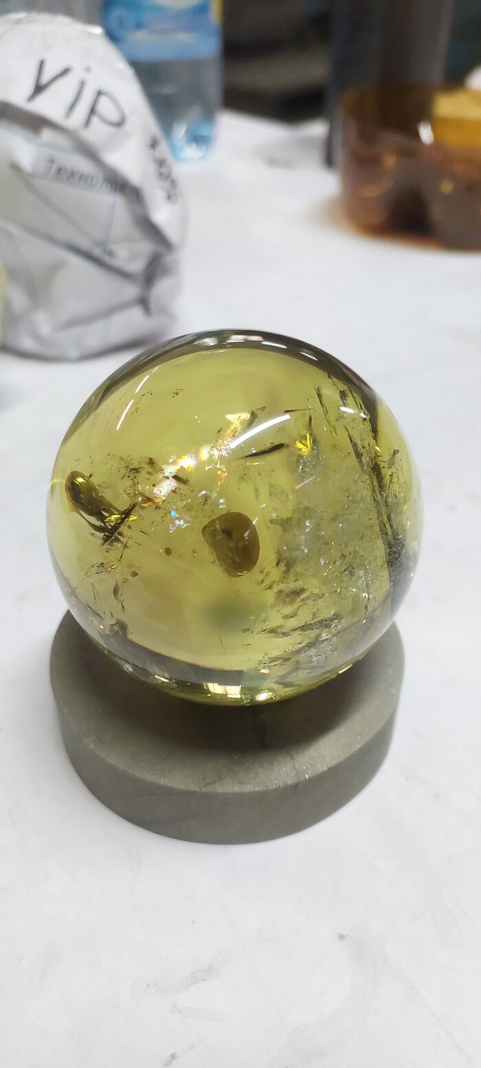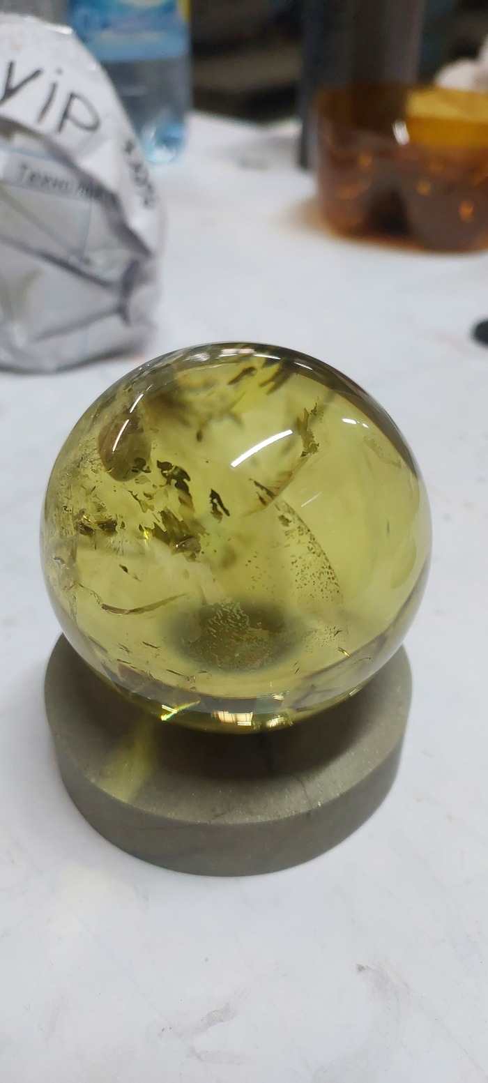 Цитрин, выглядит как осколок стекла, но это не оно) Светло-лимонный, отличной прозрачности и почти без вкраплений, из него можно сделать кабошон или ювелирные вставки в украшения, но мне так не интересно, из такого же камня я показывала тут толстого котика