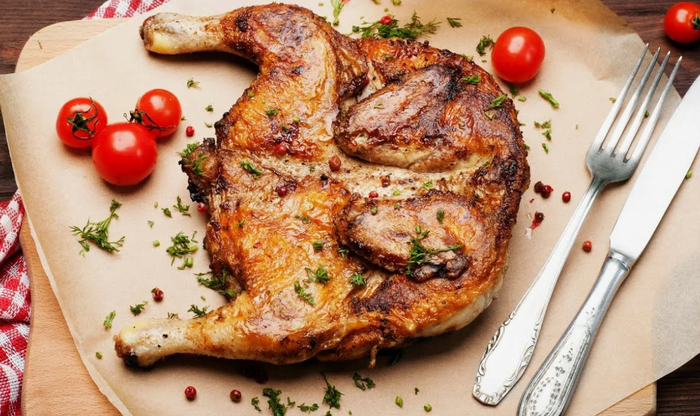 Смысл приготовления прост: расплющить маленького цыпленка, придавить его крышкой и жарить до хрустящей корочки. Благодаря сильному нажиму и жару мясо получается сочным внутри и хрустящим снаружи. Никакого маринада не требуется – достаточно соли, перца и чеснока. Простое и вкусное блюдо. И самое главное - никакого табака.