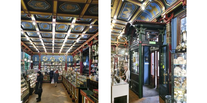 Особо ценными признали и интерьеры магазина. Это кессонный потолок с позолоченным орнаментом и росписью, фонари, резные деревянные элементы декора: столбы, настенные пилястры и филенки. Эксперты отметили предметы интерьера и мебель, например, две китайские полутораметровые вазы и шкафы-витрины, сохранившиеся со времени открытия магазина.
