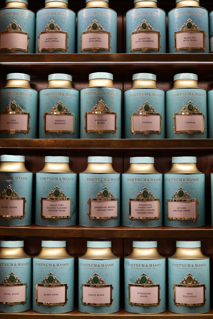 Переднюю стену украшает лепнина в виде драконов, змей, китайских зонтиков и фонариков, а также надписи: «Чай», «Сахар», «Кофе», «Шоколад», «Какао», «Фрукты». Шрифт, которым они выполнены, напоминает китайские иероглифы. Декор отличается обилием скульптурных деталей и керамических плиток.