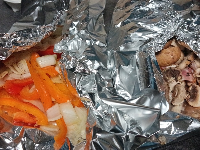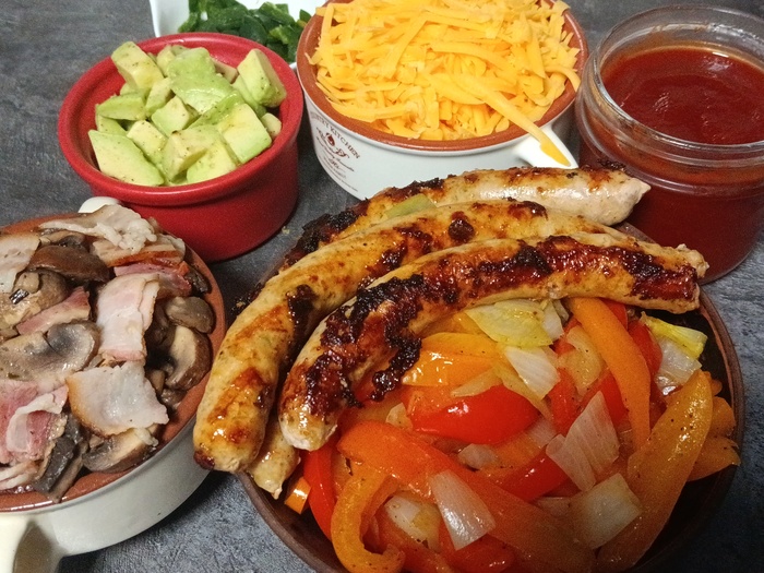 Колбаски маринованные в пиве и обжаренные на гриле с овощами, шампиньонами и беконом. При подаче добавим чеддер, халапеньо и авокадо. И еще будет вкуснейший домашний кетчуп.