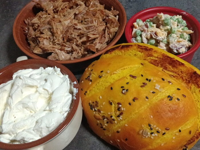 Выложите крем чиз на нижнюю булочку, затем свинину и салат с горошком. Накройте верхней булочкой.